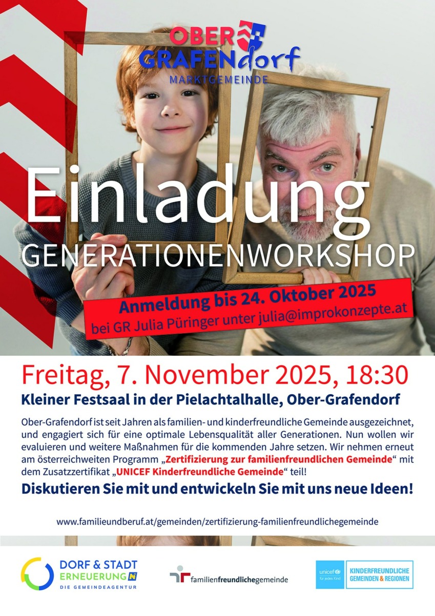 Im Zuge der Rezertifizierung zur familienfreundlichen Gemeinde findet am Donnerstag, 7. November 2025, um 18:30 Uhr ein Generationenworkshop im kleinen Festsaal statt. Dabei haben interessierte Bürger:innen die Möglichkeit, gemeinsam über Zukunftsthemen, generationsübergreifende Angebote und neue Ideen für den Lebensraum Ober-Grafendorf zu diskutieren.