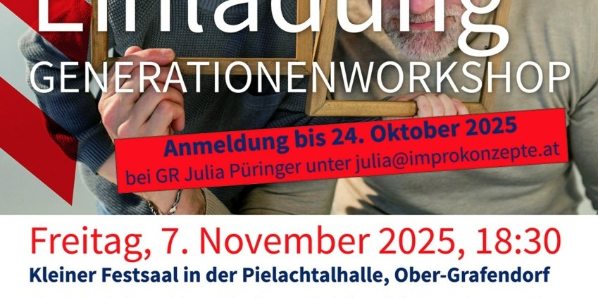 Im Zuge der Rezertifizierung zur familienfreundlichen Gemeinde findet am Donnerstag, 7. November 2025, um 18:30 Uhr ein Generationenworkshop im kleinen Festsaal statt. Dabei haben interessierte Bürger:innen die Möglichkeit, gemeinsam über Zukunftsthemen, generationsübergreifende Angebote und neue Ideen für den Lebensraum Ober-Grafendorf zu diskutieren.