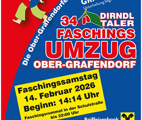 Die Ober-Grafendorfer Schulen laden zum 34. Dirndltaler Faschingsumzug ein.