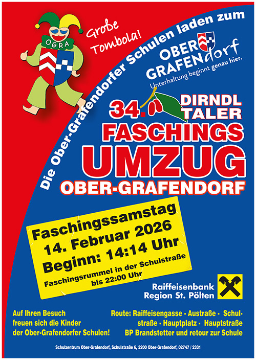 Die Marktgemeinde Ober-Grafendorf wünscht allen Teilnehmer:innen und Gästen einen fröhlichen und sicheren Faschingstag.